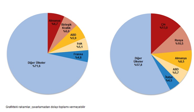 در دوره ژانویه تا دسامبر، آلمان مقصد برتر صادرات بود. صادرات به آلمان بالغ بر ۲۲.۱۶۷ میلیارد دلار، و پس از آن بریتانیا با ۱۶.۷۷۳ میلیارد دلار، ایالات متحده با ۱۶.۳۲۸ میلیارد دلار، ایتالیا با ۱۳.۲۳۲ میلیارد دلار و عراق با ۱۲.۳۸۰ میلیارد دلار قرار داشتند. صادرات به این پنج کشور برتر ۲۹.۶٪ از کل صادرات را تشکیل میداد.