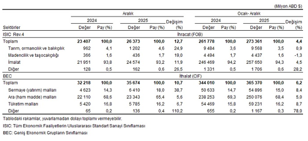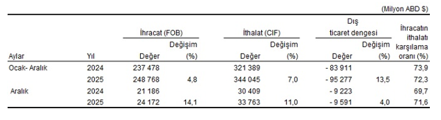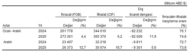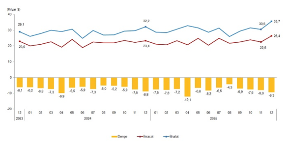 طبق دادههای موقت تجارت خارجی که تحت سیستم تجارت عمومیبا همکاری موسسه آمار ترکیه و وزارت تجارت تهیه شده است؛ در دسامبر ۲۰۲۵، صادرات ۱۲.۷ درصد نسبت به ماه مشابه سال قبل افزایش یافته و به ۲۶ میلیارد و ۳۷۳ میلیون دلار رسیده است، در حالی که واردات ۱۰.۷ درصد افزایش یافته و به ۳۵ میلیارد و ۶۷۴ میلیون دلار رسیده است.