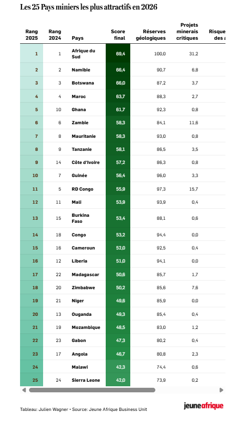 نمونه گروه دولتی مراکشی OCP ثابت میکند که این امر امکانپذیر است. از طریق آن، این کشور موفق به ساخت زیرساختهای باکیفیتی شده است که فسفاتها را به کود تبدیل میکند. محصولات نهایی به سراسر قاره و سایر نقاط جهان صادر میشوند. اما اولویت سرمایهگذاران خارجی، بیش از هر چیز، تأمین منابع خود است، زیرا فرآوری اغلب به معنای از دست دادن کنترل بر زنجیره ارزش است. بنابراین چین در طیف وسیعی از مواد معدنی، به ویژه مهمترین آنها، بر این بخش تسلط دارد و از دست دادن سهم بازار استقبال نمیکند. این دقیقاً همان نبردی است که جمهوری دموکراتیک کنگو و زامبیا در حال حاضر در بخش باتری در حال انجام آن هستند و به ویژه استدلال میکنند که فرآوری محلی میتواند از نظر اقتصادی برای اپراتورها سودمند باشد. با صادرات حجمهای کمتر اما محصولات با ارزش بالاتر، اگر هزینهها کنترل شوند، معادله مطلوب میشود. در همین راستا ژون آفریک فهرستی از کشورهای برتر در حوزه معادن را منتشر نموده است.