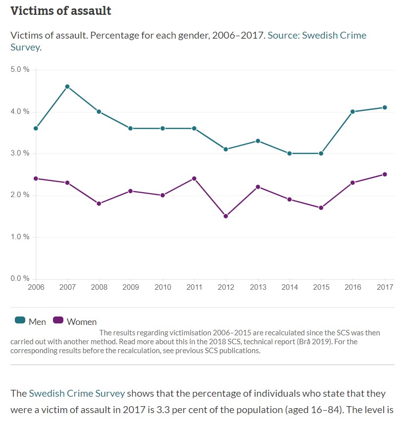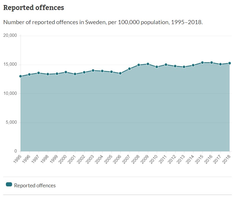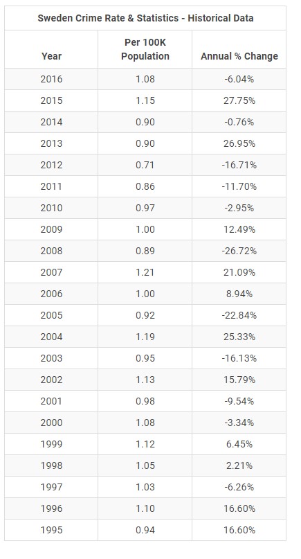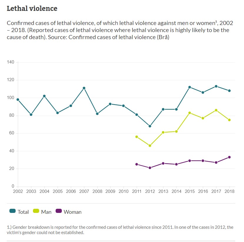 نمودارهای مربوط به جرایم مرگبار سوئد و مقایسه آن با دیگر کشورهای غربی که در پایان این گزارش آمده است، نشان می دهد؛ وضعیت سوئد چندان وخیم نیست و در میانه جدول قرار دارد، ولی روند رو به رشدی دارد و این روند موجب نگرانی شده است.