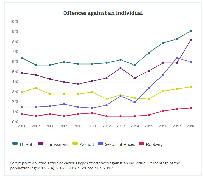 در میان انواع جرایم امنیتی اجتماعی، بیشترین حساسیت سوئدیها بر روی دو جرم؛ قتل و تجاوز است. بیشترین گزارش ها، پژوهش ها و پوشش رسانه ای در این دو زمینه صورت میگیرد. سازمانهای دولتی و غیردولتی، هر سال آمارها و گزارش های دقیق همراه با جزییات کامل منتشر میکنند. سپس پژوهشگران دانشگاهی، به تحلیل از زوایای مختلف میپردازند.