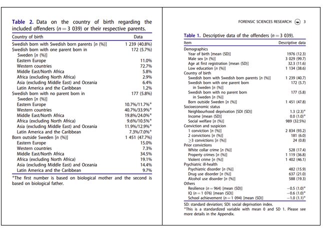 در سوئد، نام بردن از قومیت و مذهب مجرمان ممنوع است به همین دلیل، گزارش ذکر شده به مناطق جغرافیایی مجرمان اشاره میکند، بر اساس آن، سهم مناطق جغرافیایی از مجرمان سنگین به صورت زیر است:
