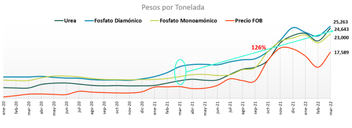 قیمت کود شیمیایی طی یکسال گذشته منتهی ابتدای ماه مارس 2022 به میزان 89 درصد در سطح جهانی افزایش یافته است. اما در داخل مکزیک به دلیل افزایش قیمت هزینههای حمل و نقل و جنگ روسیه و اوکراین تا تاریخ مورد اشاره قیمت ها نسبت به یک سال گذشته 126 درصد افزایش یافته است. در ابتدای ماه مارس قیمت فوب هر تن کود شیمایی 17589 پزو (880 دلار آمریکا) بوده است اما هر تن کود شیمیایی در انواع مختلف در ابتدای ماه مارس 2022به مکزیک به مبلغ 23 لغایت 25 هزار پزو (1150-1250 دلار آمریکا) می رسد.