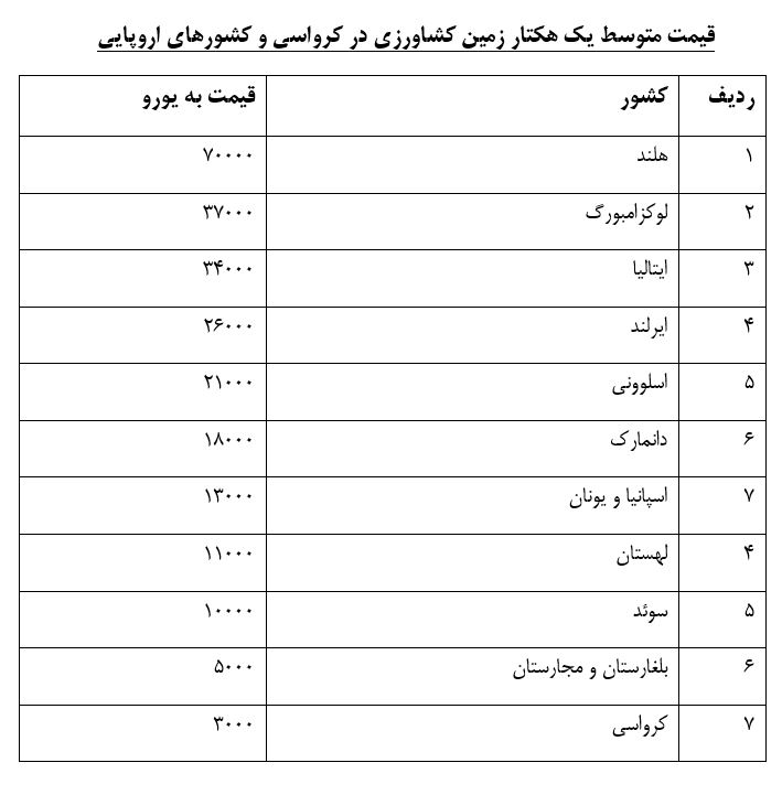 هم اکنون اتباع خارجی میتوانند از طریق شرکت های خود اما نه به عنوان افراد حقیقی، زمین بخرند. طبق میانگین، یک هکتار زمین کشاورزی در کرواسی هفت برابر ارزان تر از کشور همسایه اسلوونی و 11 برابر ارزان تر از ایتالیا است. در مجارستان، یک هکتار زمین قابل کشت حدود 5000 یورو است، در رومانی زمین در مدت کوتاهی به 7000 یورو جهش کرد، اما کرواسی با میانگین حدود 3000 یورو در هکتار، همراه با اسلواکی و کشورهای بالتیک همچنان در انتهای جدول قرار دارد. در صربستان، یک هکتار زمین کشاورزی به طور متوسط حدود 6600 یورو است.