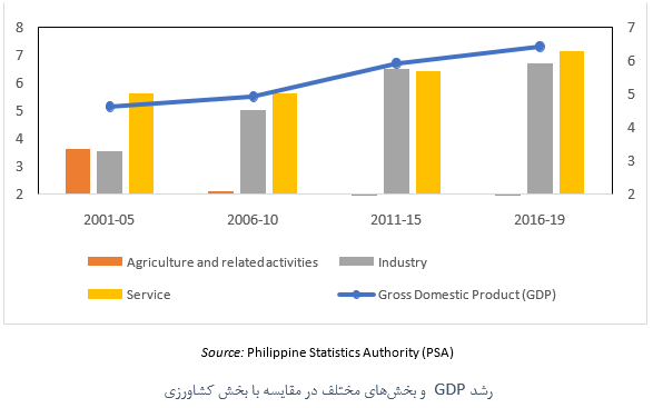 همچون سایر کشورهای با درآمد متوسط که شهرنشینی در آنها به سرعت در حال رشد است، فیلیپین نیز در حال تجربه یک تحول ساختاری در اقتصاد خود است. به عنوان بخشی از این تحول، سهم بخش کشاورزی در تولید ناخالص داخلی (GDP) از 13 درصد به 9.3 درصد بین سالهای 2008 و 2018 کاهش یافته، در حالی که سهم خدمات در این مدت افزایش داشته است. اگرچه سهم رو به کاهش بخش کشاورزی از GDP نمیتواند به تنهایی نشانه ای از رکود یا نزول این بخش باشد، اما بررسی دقیقتر آمار نشان میدهد که بخش کشاورزی فیلیپین در دهههای اخیر عملکردی کمتر از جایگاه و ظرفیت واقعی خود داشته است. در واقع بخش کشاورزی فیلیپین هم به صورت مطلق و هم نسبت به رقبای منطقهای این کشور، تولید، بهرهوری و رشد تجارت کندتر و تغییرات ساختاری و تکنولوژیکی محدودتری را تجربه کرده است.