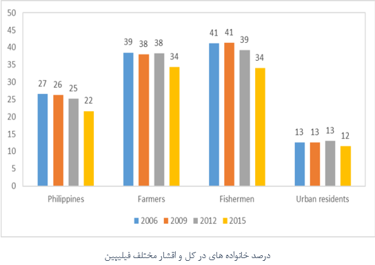 طی 4 دهه گذشته سیاست گذاری ضعیف، کمتوجهی به توسعه پایدار کشاورزی و توزیع نابرابر امکانات در بخش کشاورزی، فقر را در مناطق روستایی فیلیپین گسترش داده است. تنها کمکهای مالی کارگران فیلیپینی خارج از کشور به خانوادههایشان باعث شده که روستاییان از فقر فلجکننده ناشی از رکود و کاهش بهرهوری کشاورزی، رقابت سخت ناشی از واردات ارزانتر مواد غذایی و خشکسالیها و سیلهای دورهای که محصولات کشاورزی و دامی را ویران میکند، جان سالم به در ببرند. اگرچه فقر در میان کشاورزان و ماهیگیران فیلیپینی در طول زمان شاهد روندی کاهشی بوده، اما همچنان بسیار بالاتر از میانگین کشوری و تقریباً سه برابر بیشتر از فقر در میان خانوارهای شهری است. نمودار زیر مقایسه ای است میان درصد خانوادههای فقیر از کل جمعیت کشاورزان و ماهیگیران و خانوارهای شهری با فقر کلی در فیلیپین در سالهای مختلف: