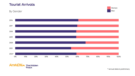 با بازگشت شرایط به دوران پیش از کرونا، گردشگران مرد، حدود شصت درصد گردشگران ورودی به ارمنستان را تشکیل میدهند.