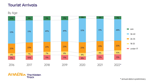 ترکیب جمعیتی گردشگران ورودی شبیه سالهای پیش است و گروه سنی میانسالان شامل افراد 36 تا 63 سال با سهم 48 درصدی، بزرگترین گروه جمعیتی ورودی به ارمنستان هستند. افراد در سن 26 تا 35 سال نیز با سهم 22 درصدی گروه قابل توجهی هستند.