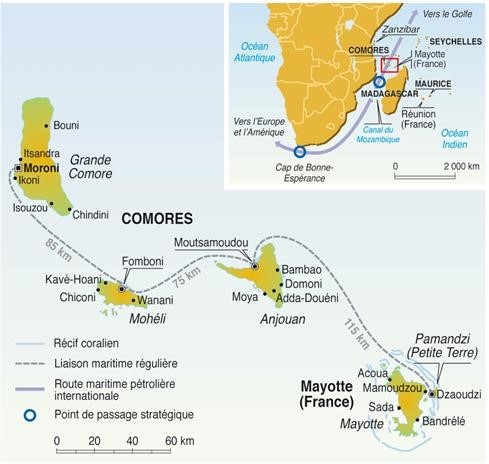 - بندر اصلی کشور، بندر موتسامودو (انجوان) تنها بندر آب عمیق (عمق 9 متر) است و کشتیهایی تا طول 185 متر را در خود جای می دهد. با این حال، گل و لای بندر باعث از دست دادن گاه به گاه عمق در اسکله میشود. بنابراین ظرفیت پذیرش آن محدود است (70000 TEU در سال) و به نظر می رسد دیگر با افزایش تجارت سازگار نیست.