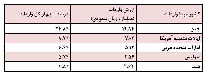 چین همچنان بزرگترین تأمینکننده واردات عربستان با 24.8 درصد از کل واردات است که نشان میدهد عربستان همچنان وابستگی قابل توجهی به واردات از کشورهای بزرگ دارد. این وابستگی میتواند یکی از چالشهای پیش روی باشد، چرا که برای تکمیل فرآیند تنوعبخشی به اقتصاد، نیاز به کاهش وابستگی به واردات و تقویت تولید داخلی احساس میشود.