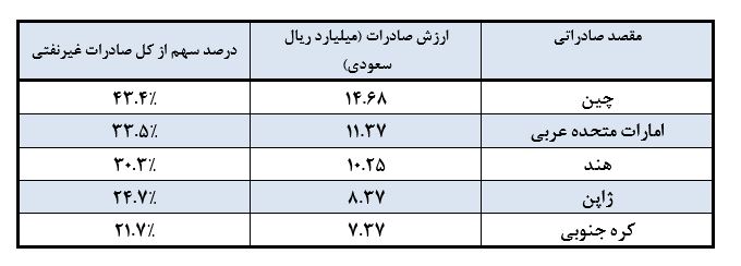 چین ، بهعنوان بزرگترین مقصد صادرات غیرنفتی عربستان با رقم چهارده میلیارد و ششصد و هشتاد میلیون ریال سعودی در صدر قرار دارد. پس از آن، کشورهای امارات متحده عربی و هند با رقمهای یازده میلیارد و سیصد و هفتاد میلیون ریال سعودی و ده میلیارد و بیست و پنج میلیون ریال سعودی در رتبههای دوم و سوم قرار دارند. این موضوع نشاندهنده دسترسی عربستان به بازارهای بزرگ جهانی است که نه تنها باعث افزایش تنوع بازارهای صادراتی میشود بلکه به ثبات اقتصادی و جایگاه عربستان در تجارت جهانی کمک میکند.
