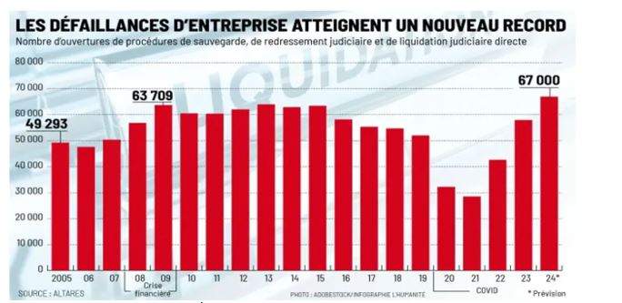 بر اساس دادههای رسمیبانک مرکزی فرانسه(Banque de France) در سال ۲۰۲۴ حدود ۶۶ هزار و ۵۰۰ شرکت در فرانسه ورشکسته شدند. این رقم در سال ۲۰۲۵ نیز همچنان رو به افزایش بوده به طوری که طبق نتابج یک بررسی صورت گرفته از سوی موسسه "آلتارس" (Altares) در سال 2025 میلادی ۶۸ هزار و ۵۶۴ پرونده ورشکستگی در فرانسه ثبت شد و رکوردی بیسابقه در این زمینه در تاریخ این کشور به ثبت رساند. این رقم نشاندهنده افزایش 3.5 درصدی نسبت به سال میلادی قبل است و نگرانیها درباره شکنندگی مالی شرکتها، به ویژه شرکتهای بزرگ و متوسط (ETI)، را تقویت کرده است.