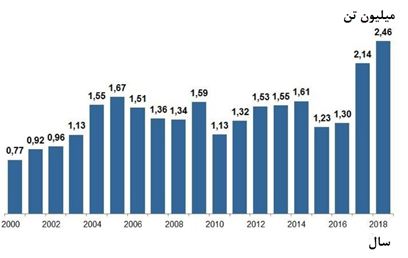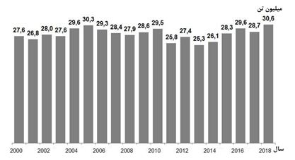 - مجموع صادرات فولاد و نورد (بدون احتساب لوله) در سال 2018، %6.5 افزایش داشته و به 30.6 میلیون تن رسیده است. صادرات روسیه از سال 2000 تا 2018 در نموادر قابل مشاهده میباشد: