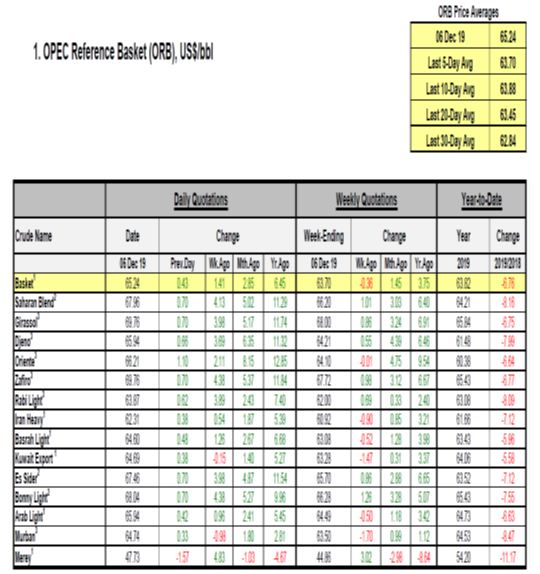 سازمان کشورهای صادر کننده نفت، اوپک، به صورت روزانه اقدام به انتشار بولتن آخرین تحولات بازار نفت، از جمله تغییرات قیمت، خرید و فروش و همچنین اخبار مرتبط رسانهها در این حوزه می نماید. اهم موارد مطرح در بولتن مورخ 7 دسامبر 2019 ( 16 آذر ماه 1398 ) به شرح زیر میباشد.