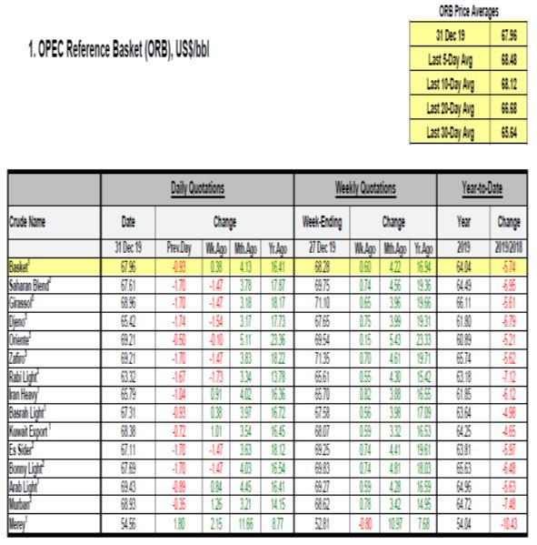 • قیمت سبد نفتی اوپک با کاهش 93 سنتی در روز سه شنبه 10 دی ماه (31 دسامبر)، به 67.96 دلار در هر بشکه رسید. تغییرات دیگر سبدهای نفتی نیز به جز سبد نفتی ونزوئلا متغییر بودند. قیمت های آتی نفت بعد از رسیدن به بالاترین میزان خود در 3 ماه گذشته، کاهش یافت. بورس های نفتی تگزاس و برنت بالاترین میزان سود خود را در سال های اخیر به دست آوردند که علت نیز بازار متعادل و پیشرفت ها در گفتگوهای تجاری میان چین و آمریکا بود.