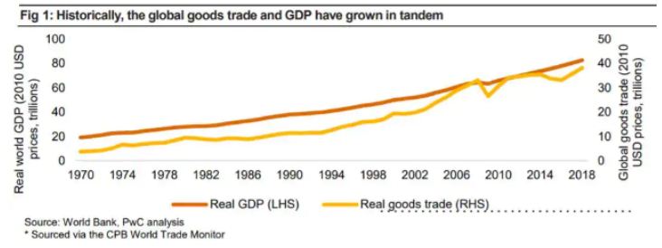 نمودار زیر نشان میدهد که جریان رشد تجارت کالا و اقتصاد به طور ذاتی با هم در ارتباط هستند. انتظار میرود که در سال 2020 اقتصاد جهانی با نرخ حدود 3.5% گسترش یابد که این نرخ، پایین تر از میانگین قرن بیست و یکم که در حدود 3.8% است، خواهد بود.