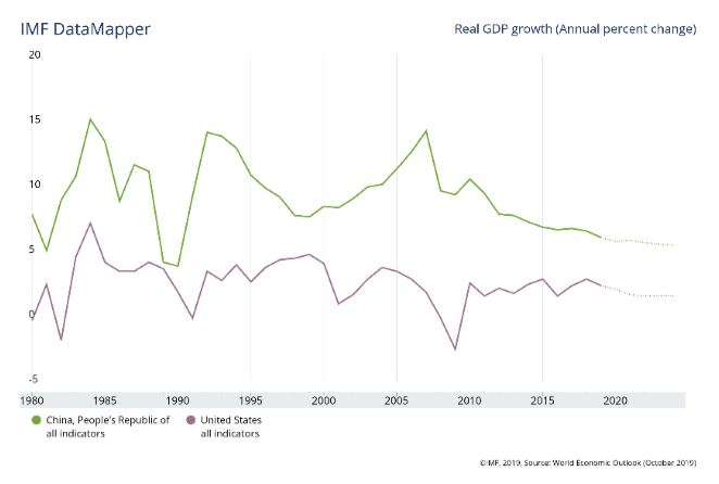 در برخی از پیش بینیها مبنی بر این که چین در سال 2020 از ایالات متحده پیشی خواهد گرفت و به اقتصاد برتر جهان تبدیل خواهد شد، اغراق شده است، اما شاید بتوان گفت که اقتصاد آن سریعتر از ایالات متحده رشد خواهد کرد. بر اساس آمار صندوق بین المللی پول، سرعت رشد GDP چین در سال 2019، 6.1% و پیش بینی برای سال 2020 رقم 5.8 درصد خواهد بود . این در حالی است که این رقم برای کشور ایالات متحده در سال 2019 معادل 2.4 درصد و پیش بینی برای سال 2020 نیز 2.1 درصد خواهد بود.