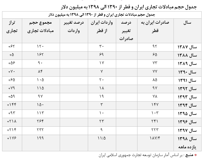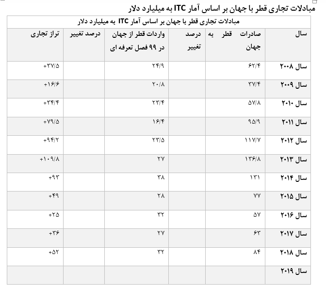آمار و عملکرد تجارت خارجی قطر از جمله مبادلات تجاری این شیخ نشین با سایر کشورها در فاصله زمانی 2018 - 2008 میلادی و نیز آمار منابع رسمی این کشور در ارتباط با روابط تجاری دو جانبه با جمهوری اسلامی ایران در دوره زمانی ( 2018 - 2007 ) میلادی و نیز آمار مشابه سازمان توسعه تجارت در فاصله زمانی 1390 تا 1398 به شرح ذیل اعلام می گردد ؛