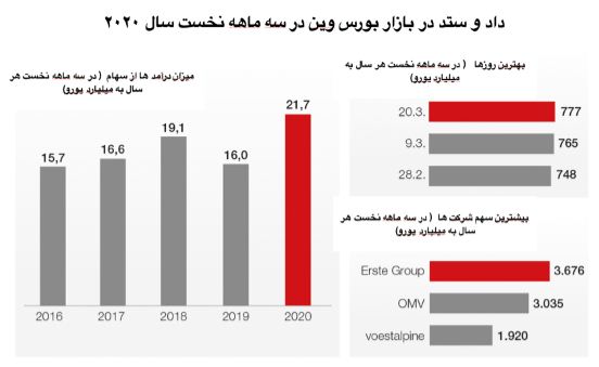 - بورس سهام و اوراق بهادار وین از سال ۱۹۹۸ کاملا خصوصی شد و از آن پس به عنوان شرکت سهامی عام بورس وین شناخته میشود . بازار بورس وین نخستین بازار بورس اوراق بهادار اروپای شرقی بوده و به عنوان یکی از قدیمیترین بازارهای بورس جهان محسوب میشود. نمودارهای داد و ستد در بازار بورس وین در سه ماهه نخست سال جاری میلادی و نیز شرکت های عمده حاضر در شاخص بورس اتریش برای آگاهی به شرح زیر است :