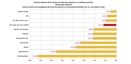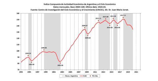 بررسی شاخص ترکیبی فعالیت های اقتصادی (ICAE) در ماه مارس 2020 نشان می دهد که از نظر تولید ناخالص داخلی شدت رکود اقتصادی که در نوامبر 2017 آغاز شد و 28 ماه به طول انجامید 8.6 درصد کمتر از رکودی است که کرونا ویروس به اقتصاد آرژانتین تحمیل نموده است.