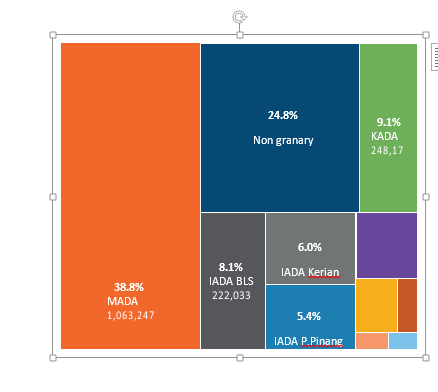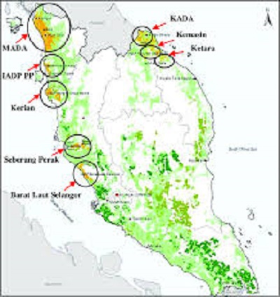تولید و کشت برنج براساس برنامه ریزیهای صورت گرفته در 10 منطقه معین صورت میگیرد که براساس اطلاعات جدول زیر بیشترین زمینهای زیر کشت مربوط به مناطق شمالی مالزی است که تحت کنترل سازمان MADA (Muda Argricultural Development Authority) است. در حدود 40 درصد از تولید شلتوک برنج مالزی نیز در زمینهای همین منطقه بدست می آید.