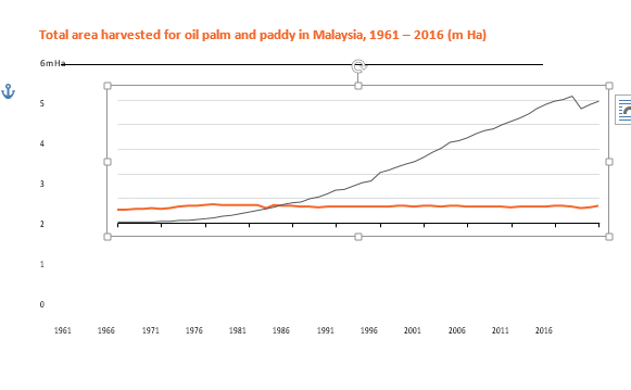 در نمودار زیر میتوان تغییر سطح زیر کشت در مزارع پالم ( نخل ) و برنج را مقایسه نمود :