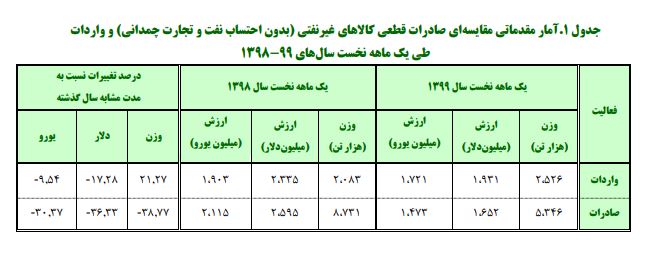 بنا به آمار منتشره از سوی گمرک جمهوری اسلامی ایران در یک ماهه نخست سال 1399،میزان صادرات قطعی کالاهای غیرنفتی کشور (به استثنای نفت خام، نفت کوره و نفت سفید و همچنین بدون صادرات از محل تجارت چمدانی)، بالغ بر 5.346 هزار تن و به ارزش 1.652 میلیارد دلار بوده است که در مقایسه با مدت مشابه سال 1398،کاهشی 38.77 درصدی در وزن و 36.33 درصدی در ارزش دلاری داشته است. همچنین میزان واردات کشور در این مدت، با افزایشی 21.27 درصدی در وزن و کاهشی 17.28 درصدی در ارزش دلاری در مقایسه با مدت مشابه سال 1398 ،به ارقام 2.526 هزار تن و 1.931 میلیارد دلار رسیده است.