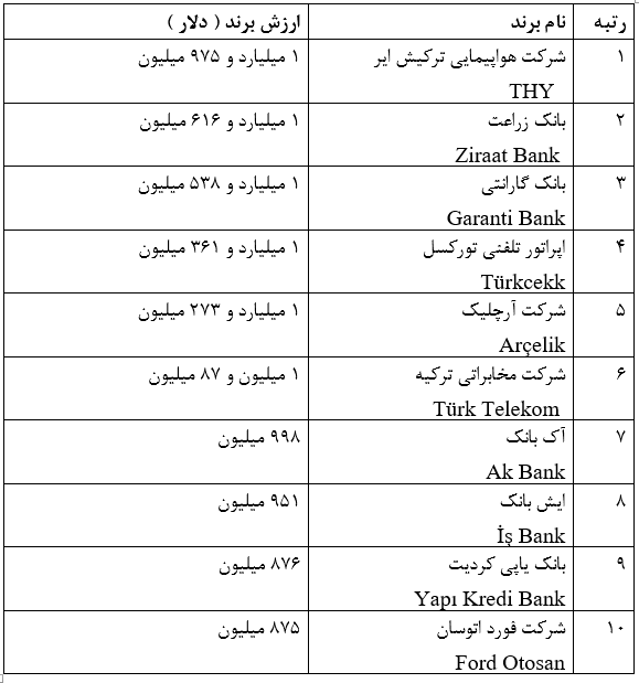 موسسه تحقیقاتی فاینانس برند Brand Finans در ارزیابی برندهای با ارزش ترکیه که نقش مهمی در پویایی اقتصاد این کشور دارند گزارشی تحت عنوان ‘’ با ارزش ترین برندهای ترکیه – ترکیه 100 ‘’ منتشر کرد که بر اساس آن 10 برند نخست ترکیه به ترتیب ذیل میباشد: