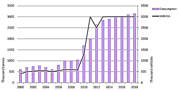 شکل 1- مقدار مصرف اتوگاز و تعداد خودروهای LPG سوز روسیه از سال 2000 تا 2018
