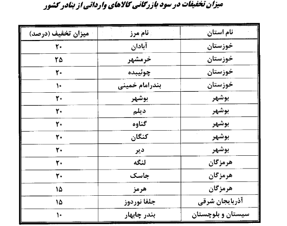 بر این اساس کالاهای وارداتی از مرزهای فهرست جدول زیر، مشمول تخفیف سود بازرگانی از ده درصد تا بیست و پنج درصد میباشند.