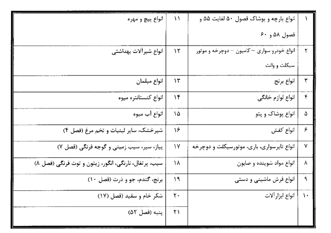 کالاهایی که در جدول زیر ذکر شده است و همچنین کالاهای ترانزیت اعم از داخلی و خارجی مشمول تخفیف نمیشوند.