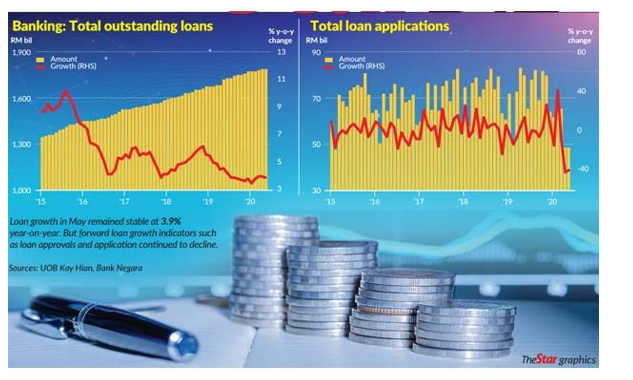 با توجه به اینکه فعالیت اصلی تجاری بانکها وابسته به اعطا وام به مشتریان است، شاخصها نشان میدهد بخصوص از ماه می 2020 وضعیت دریافت وام از بانکهای مالزی وضعیت خوبی نداشته و در ماه می درخواستها برای دریافت وام نسبت به دوره مشابه در سال قبل 39٪ کاهش داشته است. مجموع وامهای تصویبشده به میزان 54.4٪ کاهشیافته و بیشترین کاهش تقاضا برای وامهایی جهت امور مصرفی بوده که به میزان 58.5٪ کاهشیافته و دلیل آن این است که مصرفکنندگان در هزینه کردن در اموری چون خرید خانه و خودرو محافظهکاری بیشتری نشان داده و در شرایط بی ثابتی اقتصادی در این بخش کمتر هزینه میکنند. بانکها برای تشویق مشتریان نرخ بهره وامها را پایین آوردهاند ولی باز از دریافت وام استقبالی نمیشود.