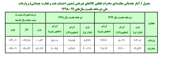 بنا به آمار منتشره از سوی گمرک جمهوری اسلامی ایران در دو ماهه نخست سال 1399 ،میزان صادرات قطعی کالاهای غیرنفتی کشور )به استثنای نفت خام، نفت کوره و نفت سفید و همچنین بدون صادرات از محل تجارت چمدانی) بالغ بر 14552 هزار تن و به ارزش 4300 میلیون دلار بوده است که در مقایسه با مدت مشابه سال 1398،کاهشی 57.79 درصدی در وزن و 48.73 درصدی در ارزش دلاری داشته است. همچنین میزان واردات کشور در این مدت، با ارزش دلاری در مقایسه با سال 1398، 26.78 به ارقام 6405 هزار تن و 5041 میلیون دلار رسیده است.