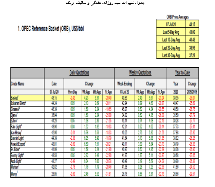 قیمت سبد نفتی اوپک با کاهش 42 سنتی در روز سه شنبه، 17 تیرماه (7 جولای 2020)، به 43.15 دلار در هر بشکه رسید. قیمت معاملات آتی نفت در روز سه شنبه تغییر نکرد. قیمت نفت در صبح سه شنبه و پس از پیش بینی آژانس بین المللی انرژی در مورد بهبود سریع تر تقاضای جهانی نفت نسبت به آنچه قبلاً تخمین زده شده بود، تقویت شد؛ ولی معاملات بعد از ظهور انتشار افزایش چشمگیر آمار مبتلایان در بسیاری از نقاط جهان و احتمال اعمال برخی محدودیت ها، مجددا کاهش یافت.