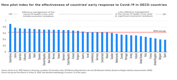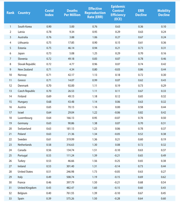 کره جنوبی ، لتونی و استرالیا در این زمینه خوب عمل کردند زیرا این کشورها نه تنها میزان آلودگی و مرگ و میر را در سطحی پایین نگه داشتند بلکه این کار را با اختلال اقتصادی و اجتماعی کمتری نسبت به سایر کشورها انجام دادند.
