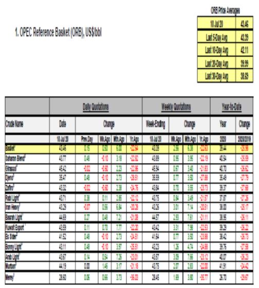 سازمان کشورهای صادر کننده نفت، اوپک، به صورت روزانه اقدام به انتشار بولتن آخرین تحولات بازار نفت، از جمله تغییرات قیمت، خرید و فروش و همچنین اخبار مرتبط رسانهها در این حوزه می نماید. اهم موارد مطرح در بولتن مورخ 21 تیر ماه 1399 (11 جولای 2020 ) به شرح زیر میباشد: