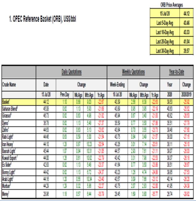 - قیمت سبد نفتی اوپک با افزایش 1.10 دلاری در روز چهارشنبه، 25 تیرماه (15 جولای 2020)، به 44.12 دلار در هر بشکه رسید. قیمت معاملات آتی نفت خام در روز چهارشنبه بیش از 2 درصد افزایش یافت تا به بالاترین سطح خود طی چهار ماه گذشته برسد. علت این افزایش، انتشار دادههای گزارش هفتگی آژانس بین المللی انرژی از کاهش شدید ذخایر نفت و بنزین ایالات متحده در هفته گذشته و نیز افزایش عملیات بهره برداری پالایشگاه و افزایش مداوم در تقاضای فرآوردههای پالایشی بود.