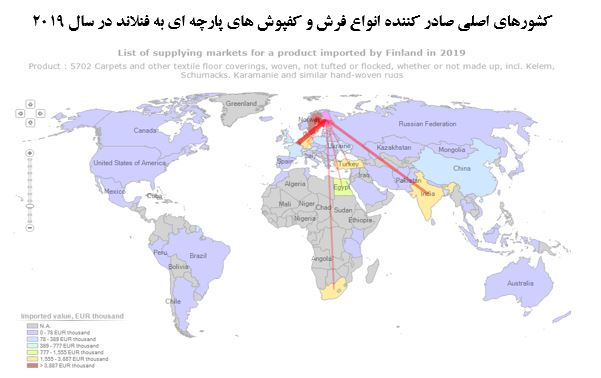 به موجب آمار مرکز تجارت بین المللی (ICT) سهم کشورمان از صادرات مستقیم فرش به فنلاند در سال 2019 بسیار ناچیز به به میزان 1.284 میلیون یورو بوده است. با توجه به مشکلات موجود بین تجارت دوجانبه بین ایران و فنلاند، فرش های ایرانی بصورت غیر مستقیم و عمدتا از طریق سایر کشورهای اروپایی همچون سوئد وارد فنلاند میگردد. در صادرات فرش دستباف ایران به فنلاند، استانهای تهران، خراسان و آذربایجان شرقی بیش از سایر استانها نقش دارند.