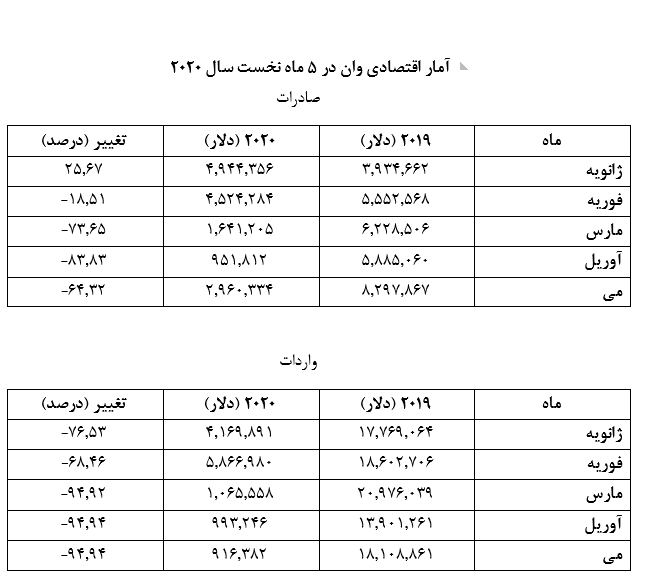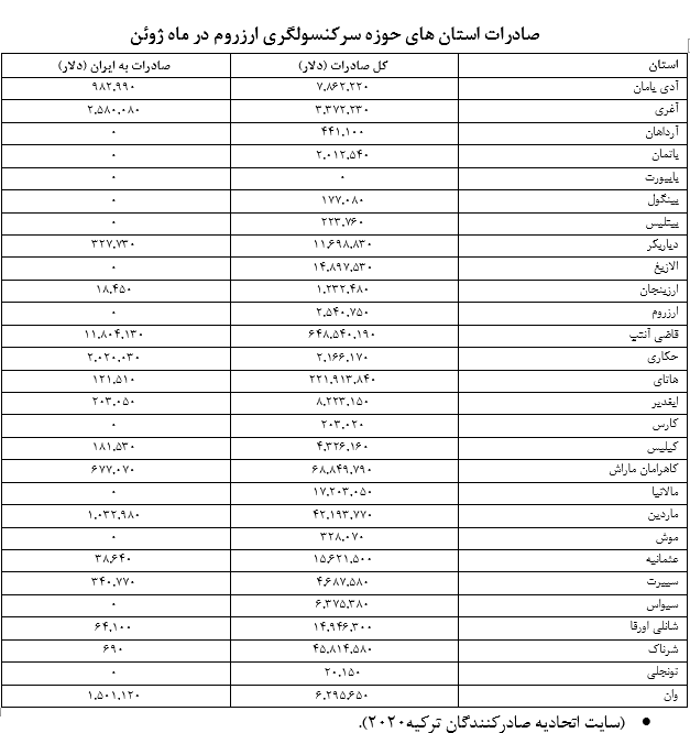 در آناتولی شرقی میزان صادرات با 2.8 درصد کاهش به رقم 322 میلیون و 308 هزار دلار و واردات با 20.7 درصد کاهش به رقم 181 میلیون و 930 هزار دلار رسیده است (سایت خبری آژانس ارزروم / erzurumajans ،مورخ 6 جولای 2020).