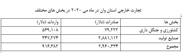 بیشترین صاردات استان وان در ماه میبا رقم 953.149 دلار به ایران و با رقم 890.376 دلار به عراق بوده است. همچنین بیشتری واردات این استان در ماه میبا 722.796 دلار از عراق بوده است (آمار اتاق تجارت و بازرگانی استان وان).