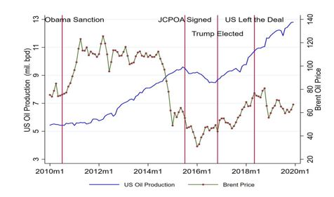 نمودار فوق، وضعیت میزان تولید نفت امریکا و نوسان قیمت نفت در دو مقطع زمانی سالهای 2010 و پس از 2016 که ایالاتمتحده تحریمهای جدیدی بر ایران وضع کرد را بهخوبی نشان میدهد.