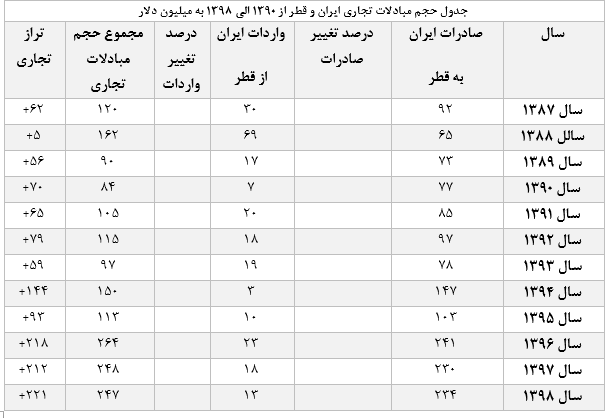 جدول حجم مبادلات تجاری ایران و قطر از 1390 الی 1398 به میلیون دلار