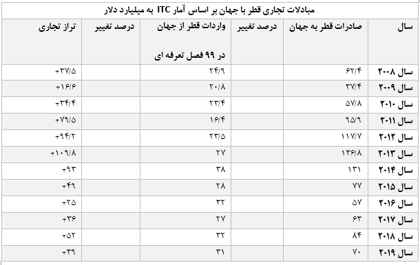 مبادلات تجاری قطر با جهان بر اساس آمار ITC به میلیارد دلار