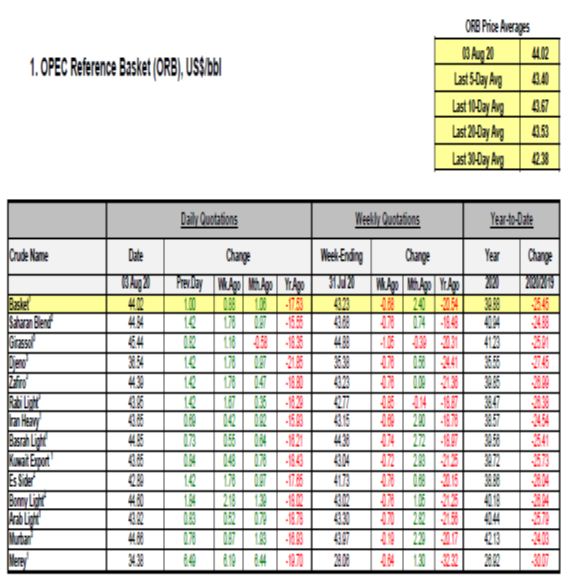 سازمان کشورهای صادر کننده نفت، اوپک، به صورت روزانه اقدام به انتشار بولتن آخرین تحولات بازار نفت، از جمله تغییرات قیمت، خرید و فروش و همچنین اخبار مرتبط رسانهها در این حوزه می نماید. اهم موارد مطرح در بولتن مورخ 14 مرداد ماه 1399 (4 آگوست 2020) به شرح زیر میباشد: