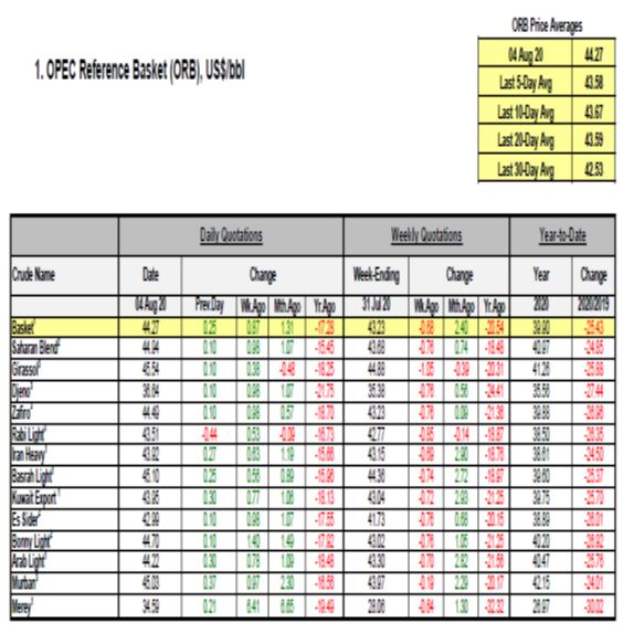سازمان کشورهای صادر کننده نفت، اوپک، به صورت روزانه اقدام به انتشار بولتن آخرین تحولات بازار نفت، از جمله تغییرات قیمت، خرید و فروش و همچنین اخبار مرتبط رسانهها در این حوزه می نماید. اهم موارد مطرح در بولتن مورخ 15 مرداد ماه 1399 (5 آگوست 2020) به شرح زیر میباشد: