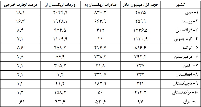 - تراز تجارت خارجی ازبکستان از میان 20 شریک اول این کشور، با 5 کشور افغانستان (330.5+ میلیون دلار)، قرقیزستان (281.5+ میلیون دلار)، تاجیکستان (141.7+میلیون دلار)، فرانسه (14.4+میلیون دلار) و امارات متحده عربی (8.1 + میلیون دلار مثبت و با 15 کشور دیگر منفی بوده است.