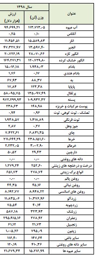 میزان صادرات محصولات باغی در سال 1398 از کشور به تفکیک محصول، در جداول زیر قابل مشاهده میباشد.