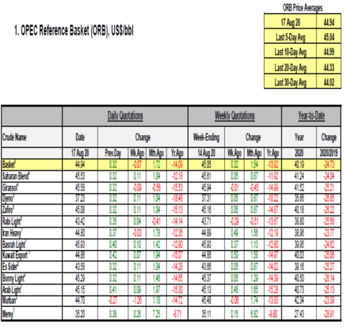 سازمان کشورهای صادر کننده نفت، اوپک، به صورت روزانه اقدام به انتشار بولتن آخرین تحولات بازار نفت، از جمله تغییرات قیمت، خرید و فروش و همچنین اخبار مرتبط رسانهها در این حوزه می نماید. اهم موارد مطرح در بولتن مورخ 28 مرداد 1399 به شرح زیر میباشد.