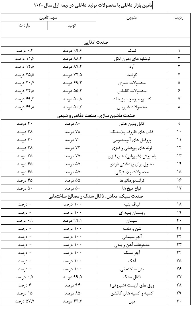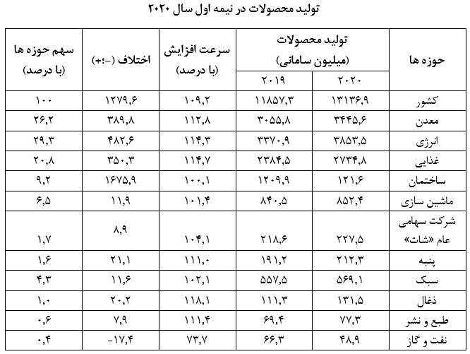 سهم حوزهها در ترکیب میزان تولید محصولات صنعتی در نیمه اول سال 2020: