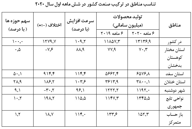 وزارت صنایع و فناوریهای جدید جمهوری تاجیکستان طی شش ماهه اول سال 2020 میزان تولید محصولات صنعتی در این کشور را 13 میلیارد و 136.9 میلیون سامانی بالغ نمود. این میزان تولید محصولات نسبت (به مدت مشابه) سال گذشته 1 میلیارد و 279.6 میلیون سامانی بیشتر میباشد.